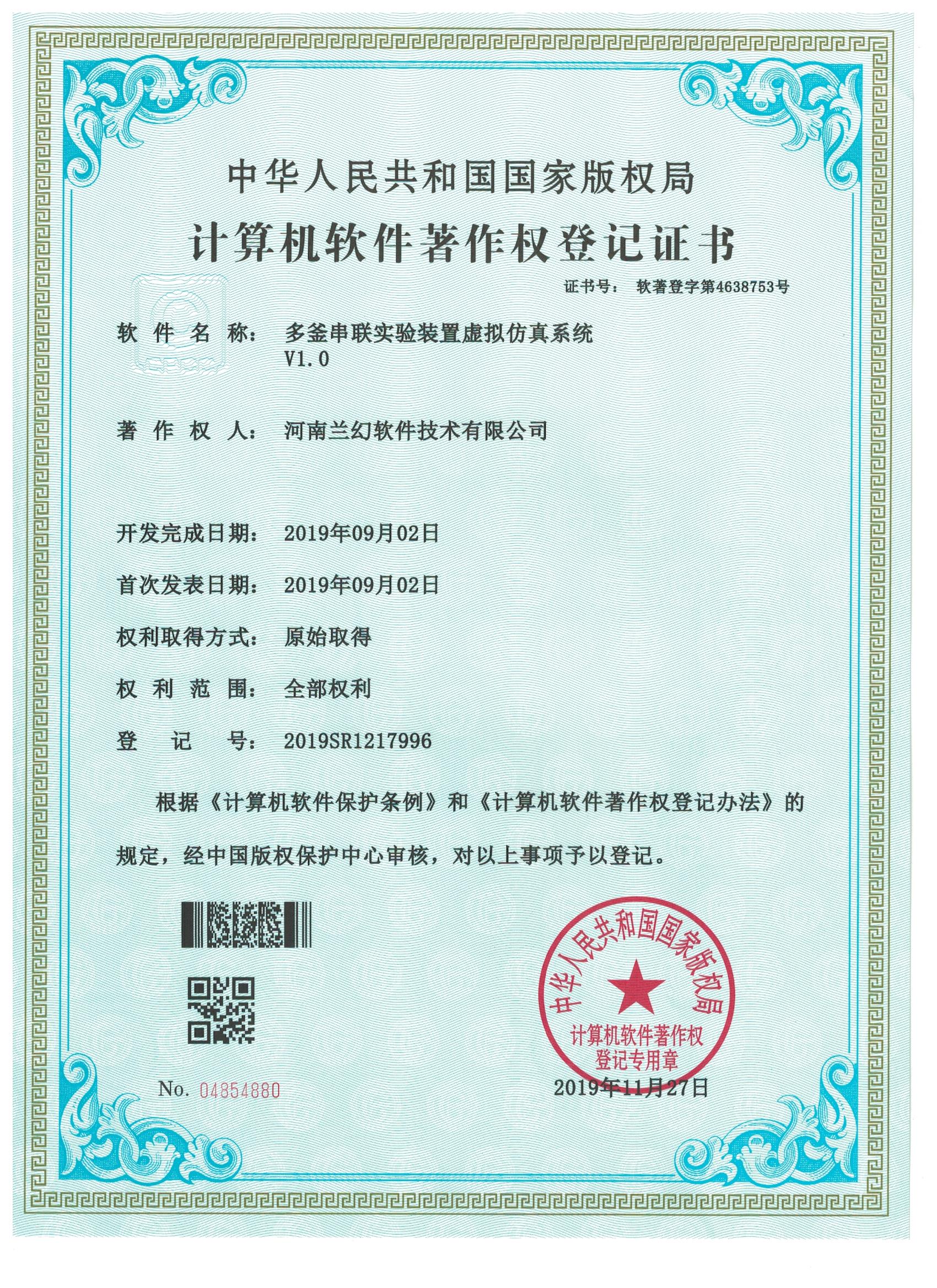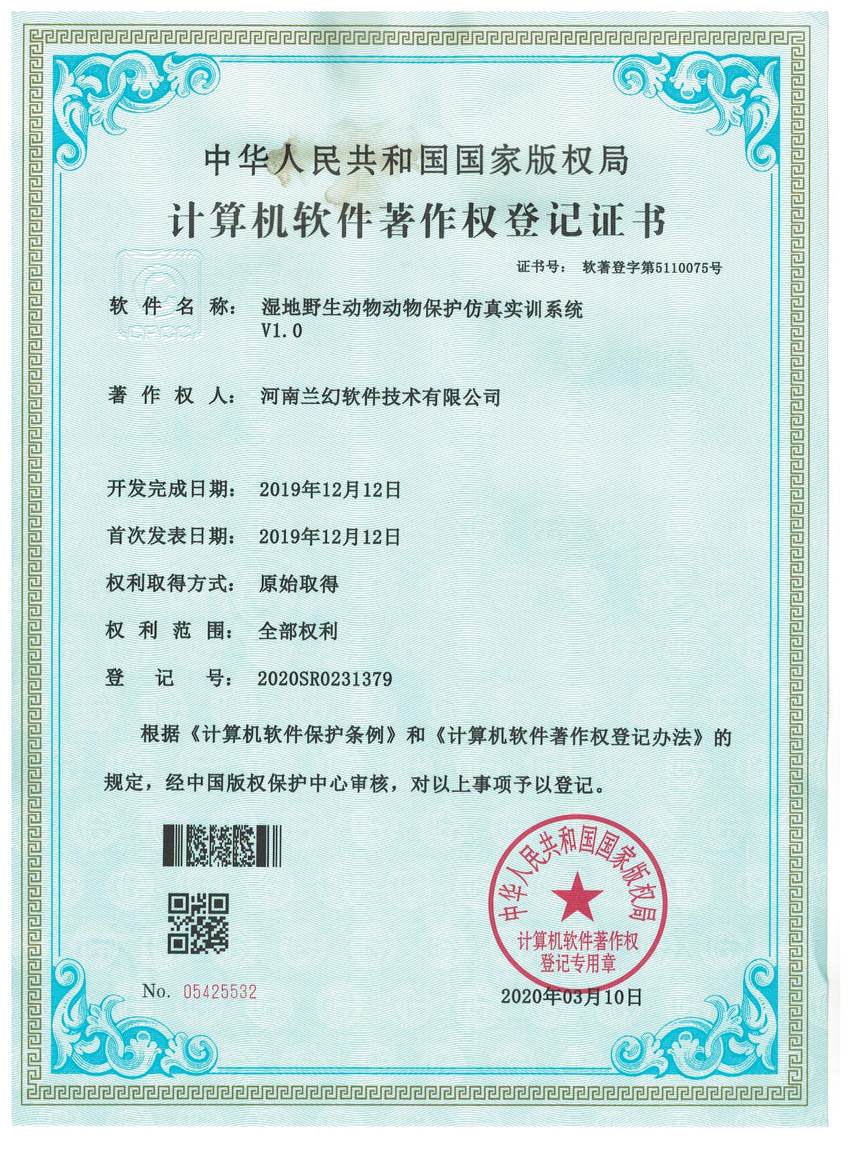 濕地野生動物保護仿真實訓(xùn)系統(tǒng)著作權(quán)證書 雙套管傳熱實驗裝置虛擬仿真系統(tǒng)著作權(quán)證書 多釜串聯(lián)實驗裝置虛擬仿真系統(tǒng)著作權(quán)證書