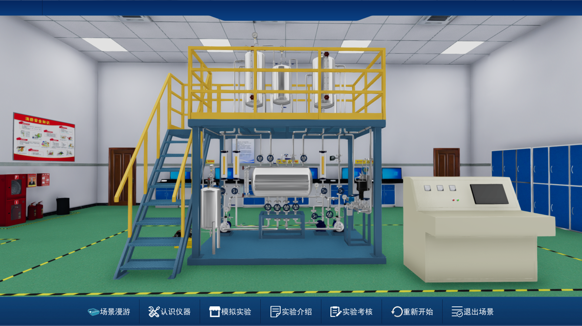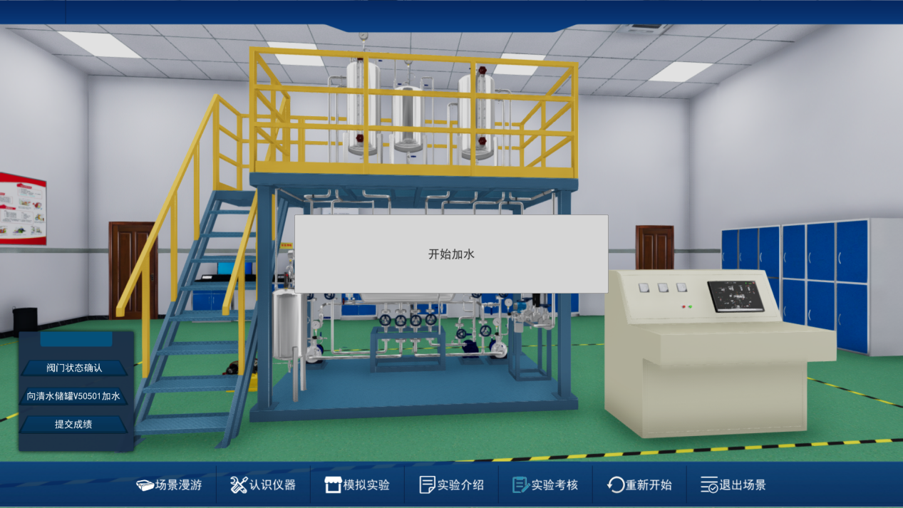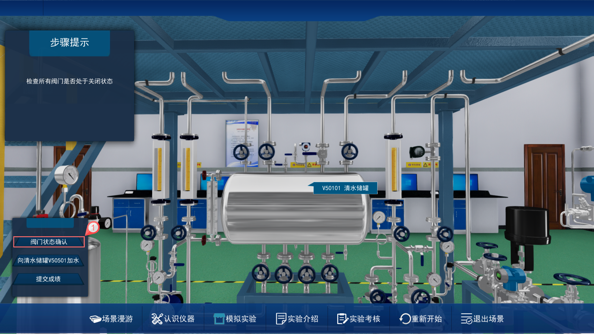 模擬實驗現場,實驗操作流程,學生可以在該功能內學習實驗操作流程。使用計算機技術設定好實驗的流程,以及設備之間的交互實驗操作,學生進入模擬實驗功能后,可以根據場景中的步驟提示,完成流體輸送實驗學習。