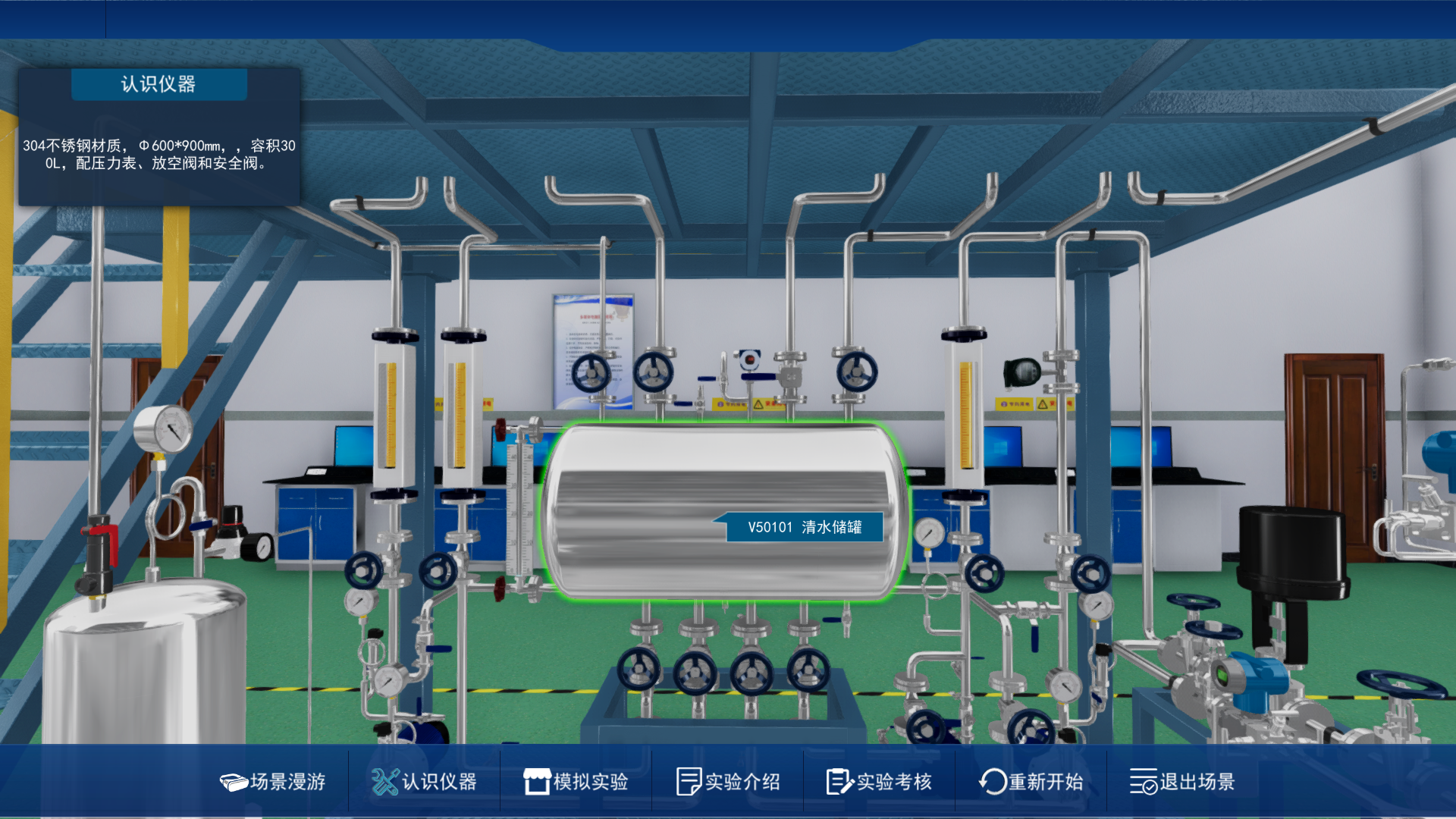 整項實驗由很多種小的設備構成,該功能滿足學生對實驗設備的認知,包括泵、流量計、壓力表、多個閥門、管道等在實驗器材中的放置位置及其用途,這也是為了后續(xù)做實驗做好準備。